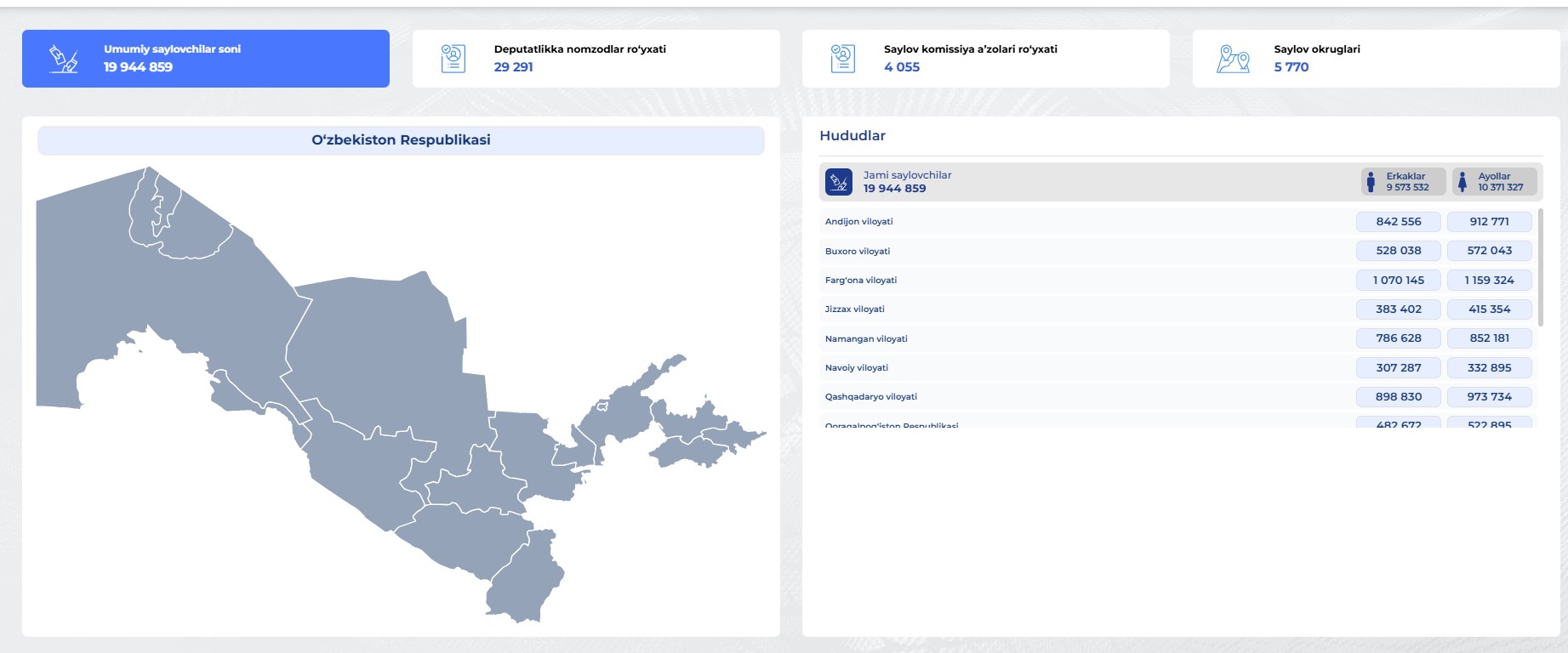 Информационная система является единственной информационной системой по выборам Президента Республики Узбекистан, депутатов Законодательной палаты Олий Мажлиса Республики Узбекистан, депутатов областных, районных и городских Советов Народных Депутаты, а также референдумы.